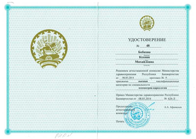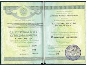 Наркология Сертификат специалиста А № 0712305 05. 11.1999 БГМИ